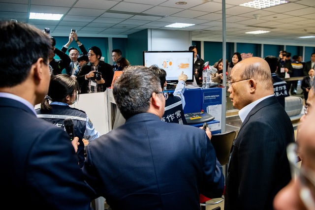 蘇院長同時要求交通部,透過旅行社等宣導、呼籲國人,勿置身疫情高風險地區,以免被傳染,甚至將疫情帶入。現在中國周邊包含日、泰、韓等國已有境外傳入的確診病例,因此我們更要提高警覺。衛福部疾管署應變中心已開設,相關部會在過年期間要堅守崗位,彼此的通訊聯絡也不能有疏漏,不僅是桃園機場,其他機場、港口、小三通等都要比照非洲豬瘟防疫嚴格把關,政府全力支持。蘇院長在桃機逐一視察出境自助報到櫃檯暨自助行李托運、出境行李安檢區、非洲豬瘟手提行李檢查區、發燒篩檢站、證照查驗區e-gate等,也仔細聽取相關部會報告,並提出看法與建議。