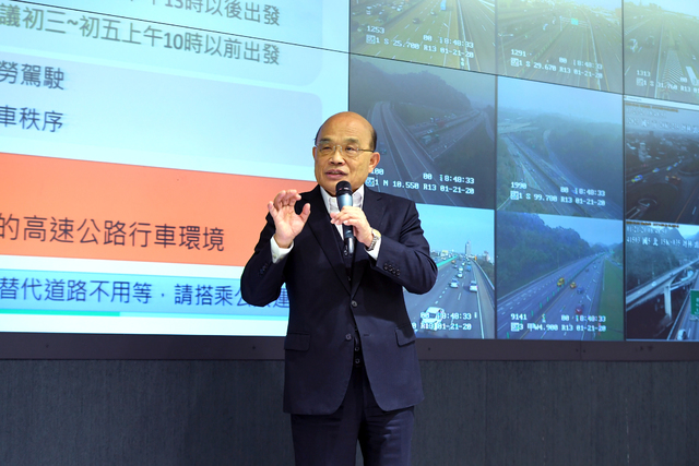 蘇院長在高公局交控中心瞭解公路疏運情形時表示,過去一年是交通人員最辛苦,也是成果最豐碩的一年,許多新的道路完成,如何讓國人妥善利用,迴避尖峰時間,不但要規劃綿密,也要徹底執行。如有突發狀況,交通部長林佳龍說一定要在20分鐘內排除,這些都要到位。台灣有一流的公路網,有好的交通工程、管理與法令,國人使用各項交通服務時,也應遵守交通規範,讓人人安全及方便。