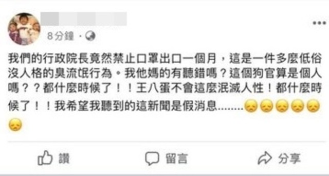 而藝人范瑋琪也在1月27日深夜時遭網友爆料,疑在私人臉書PO文飆罵「我們的行政院長竟然禁止口罩出口一個月,這是一件多麼低俗沒人格的臭流氓行為,我他X的有聽錯嗎?」並用情緒化字眼稱蘇貞昌是「狗官」,還怒轟「我他媽的有聽錯嗎?什麼時候了!!王八蛋不會這麼泯滅人性!都什麼時候了!!」 這番言論被網友截圖在PTT上瘋傳,網友都紛紛批評范瑋琪「無知」,事後她本人也公開道歉,但後續又在社群網站上貼出與家人的對話截圖,疑似想討拍,但再度引起網友不滿,最後全數刪文,至今沒有更新。