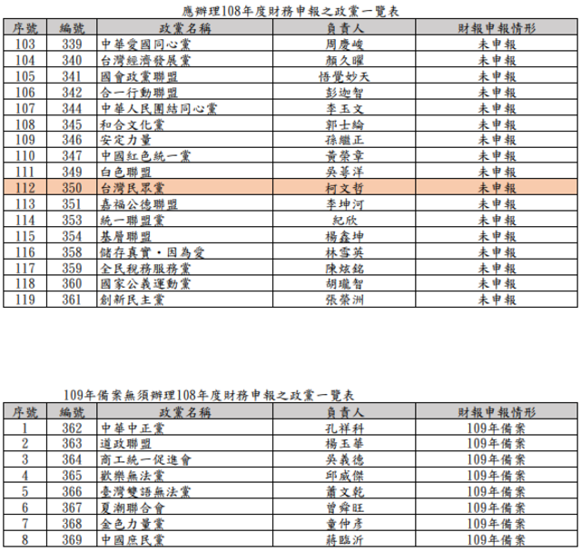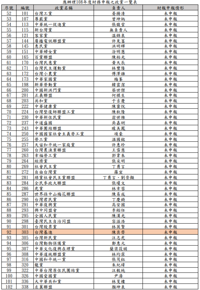政黨財報只剩4天! 內政部:仍有86個政黨未申報