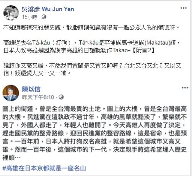 貼文一出引發熱烈討論,民進黨前青年部主任吳濬彥也分享陳以信的貼文截圖,痛批陳以信錯誤的歷史觀發文,簡直是「散播錯誤知識」,毫無身為公眾人物的道德,同時也寫下,高雄過去名Tá-káu(打狗),Táⁿ-káu是平埔族馬卡道族(Makatau)語,日本人改名為高雄,是因為漢字高雄的日語就唸作Takao。最後也不忘反酸陳以信「誰跟你又高又雄?」