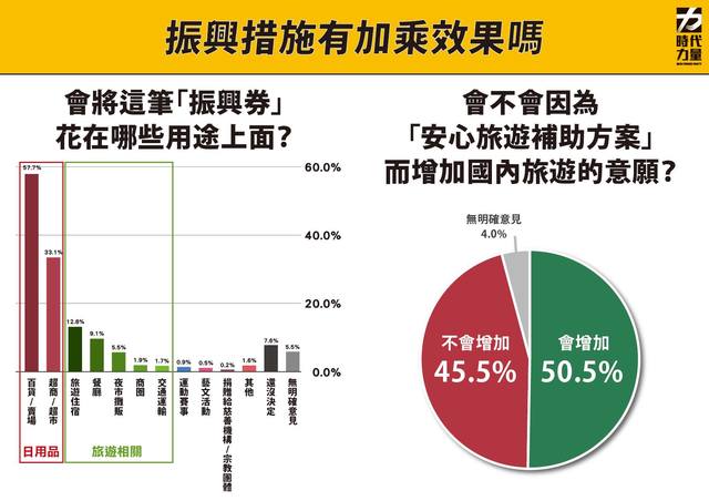 時代力量智庫執行長李兆立指出,從調查結果顯示,三倍券和國旅補助的加乘效果並不明顯,其他包括藝fun券、動滋券、農遊券等,與三倍券的對應加乘等,值得後續觀察評估。徐永明則提醒,立法院即將以臨時會處理紓困振興預算的追加,如何把舉債來的錢花在刀口上,發揮更加的振興效果,是接下來國會的審查重點。