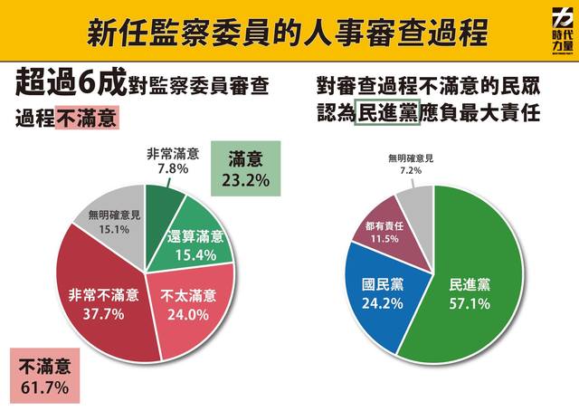 有關監察院人事同意權,有61.7%的民眾對於審查過程並不滿意,其中有57.1%認為民進黨應對此負最大責任。而對準監察院長陳菊是否能超越黨派,維持中立?38.8%的民眾有信心,53.3%的民眾沒信心。至於立法院是否會通過廢除監察院的修憲案,讓本屆成為末代監委,則有53.0%的民眾沒信心,有信心僅30.0%。