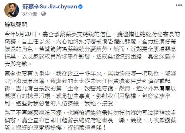 為了不再讓蔡總統困擾,也讓檢調能夠秉持勿枉勿縱的司法精神放手偵辦,嘉全宣布自即日起辭去總統府秘書長一職。最後,再次感謝蔡英文總統的厚愛與提攜,祝福國運昌隆!