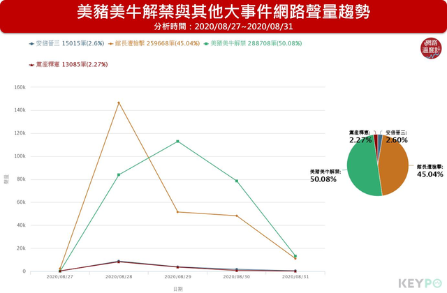 8月28日地方到國際都有大事發生,除了蔡英文於下午突然宣布開放美豬美牛,同日社會新聞大事還有知名健身教練館長遭槍擊,國際傳出日本首相安倍晉三因健康狀況辭職,就連《黨產條例》也在大法官會議做出合憲解釋。 館長遭槍擊與美豬牛宣布開放兩件大事,儘管後者與全台灣人民的健康息息相關,28日當天台灣人實際上更關心館長的花邊新聞,館長遭槍擊的聲量14萬6561筆,美豬美牛開放的聲量8萬3951筆;29日美豬美牛才竄升成為最熱門話題,聲量11萬2963筆,但仍不及前日館長聲量的高峰,且館長被槍擊後的恢復情況、嫌犯背後動機仍然讓網友相當有興趣,聲量還是有5萬1526筆。 近5日總聲量,美豬美牛解禁聲量28萬8708筆佔50.08%、館長遭槍擊聲量25萬9668筆佔45.04%、安倍晉三辭職1萬5015筆佔2.6%、黨產條例釋憲1萬3085筆佔2.27%。