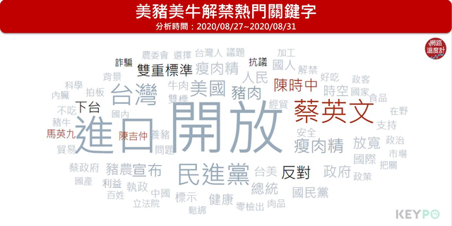 實際上美豬美牛解禁的批評集中在對執政黨態度轉變的不滿,而非事件本身。熱門關鍵字中的負面字眼包括「雙重標準」、「詐騙」、「下台」,相較之下表達對事件本身不滿的「抗議」、「反對」聲音較小,攻防集中在過去堅決反對的立場,現在為何突然轉變,甚至在民進黨有人數優勢的情況下不送國會審查,直接以行政命令宣布。 最常在此議題中被提到的人物,除了總統蔡英文強調此舉是符合國家利益及未來戰略發展,絕無雙標,擁有超高人氣的衛福部長陳時中也再上火線,替美豬美牛解禁此舉緩頰是「換來一個台灣在國際上的地位」,同時也強調人民的健康不會被作為利益交換,掛保證食安上沒有風險,甚至說願意「帶頭試吃美豬三個月」。 身為過去執政也想開放美豬美牛,遭蔡英文帶頭極力反對的前總統馬英九,質疑過去民進黨霸占主席台也堅持也擋下的政策,為何現在髮夾彎快速通過,向蔡英文喊話應向社會大眾道歉。農委會主委陳吉仲宣布明年元旦上路同時,也反擊這次開放「跟馬政府時代不一樣」。