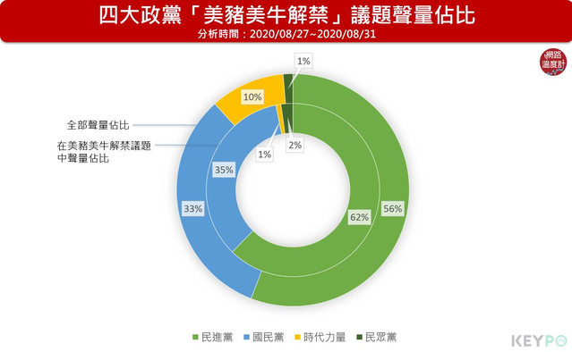比較四大黨區間總聲量(圓環圖外圈),以及在美豬美牛解禁議題的聲量佔比(圓環圖內圈),可以發現除了國民兩黨是增加且佔有一定話語權外,小黨幾乎完全邊緣化。 民進黨總聲量佔比56%,在美豬美牛開放的議題中則以62%、聲量2萬407筆居冠。身為執政黨選擇跳過立法院會審查,直接以行政命令宣布解禁美豬美牛,對比過去在野時期,不惜占領主席台也要阻擋國民黨開放美豬美牛的強烈反彈態度,讓不少支持者質疑其中立場大轉變的理由。 國民黨在此議題上有很好的發揮空間,但聲量1萬1272筆、佔比35%,僅比總聲量33%微幅增加2%。主要是同期間另外有《黨產條例》合憲,黨產將全部歸零的狀況,第一時間並沒有群起反對美豬美牛解禁政策,加上過去執政時期同樣抱持要開放的態度,說法也被網友檢視與考驗,力道因此減弱不少。目前重點放在馬英九要開放美豬美牛時仍堅持進入立法院審查,民進黨卻繞過國會的黑箱瑕疵。