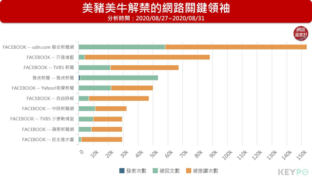 從粉專與媒體經營的成效,看誰是這次議題中的關鍵領袖,可以發現立場轉變「換了位置就換了腦袋」的內容網友最愛看。《聯合新聞網》擁有且整理出許多過去民進黨反對開放美豬美牛的資料畫面,網路上都有相當好的回響與傳散度,多數網友也抱持著看政府如何自圓其說的看熱鬧態度,嘲諷「不是不可以,是你不可以」、「到目前為止上述曾經抗議的民進黨人士,目前都裝死中」。 另外最特別的是,關鍵領袖排行第二的並非新聞媒體品牌,而是風格親綠的粉專《只是堵藍》,針對美豬美牛解禁發表的貼文超過《TVBS》,多達36篇。做法與《聯合新聞網》反其道而行,主要整理過去馬英九或國民黨支持開放美豬美牛的論調,反過來證明這次開放並無虞慮。