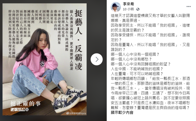 針對台灣藝人歐陽娜娜昨(30)日登上中國央視舉辦的「十一國慶」特別節目,演唱《我的祖國》,引發軒然大波一事,全國公務人員協會前理事長李來希力挺表示,「哪一個人心中沒有一個祖國?哪一個人心中沒有回歸祖國的盼望?」,大酸「台灣還是民主與自由的燈塔嗎?」。