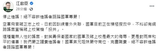 江啟臣在臉書表示,網路指稱蔣正志投共的謠言毫無人性,對英勇保衛國家的國軍及蔣正志是最大的侮辱,更是對兩岸和平的傷害,「我們嚴正譴責造謠者!國軍弟兄姐妹嚴守崗位、克盡職責,絕不容許造謠者踐踏國軍尊嚴!」。