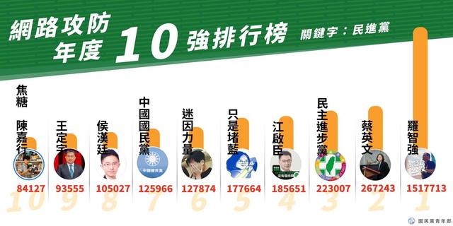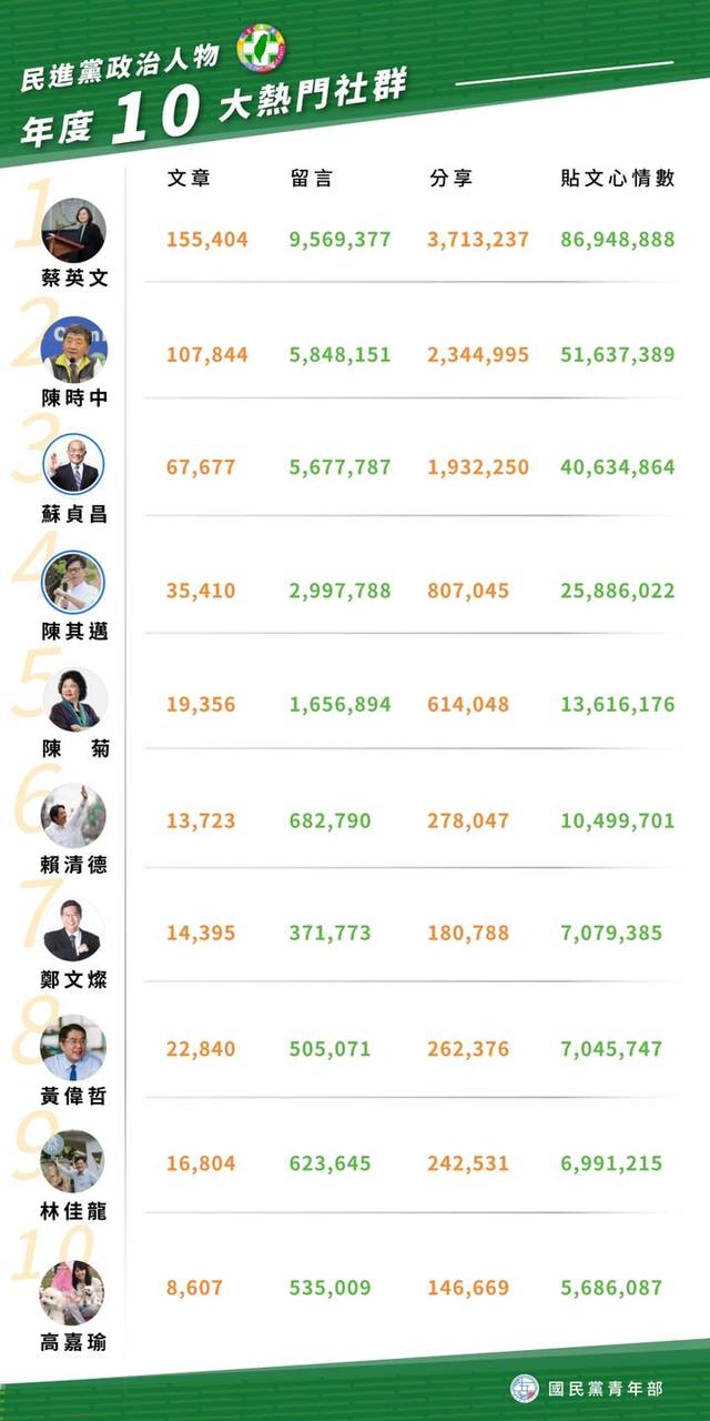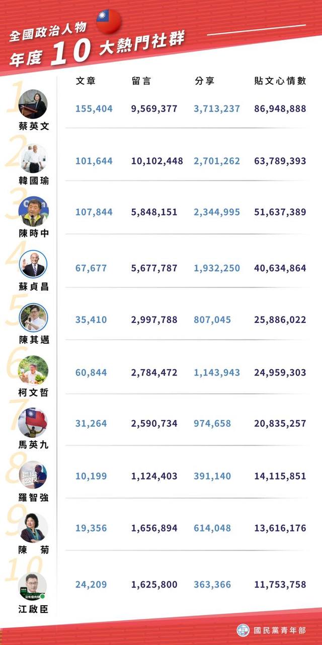 國民黨青年部今(5)日公布2020年臉書社群排行榜,從大數據分析,分別列出國民黨、民進黨和全國政治人物的熱門前10傑,以及藍、綠網路攻防年度10強排行榜。