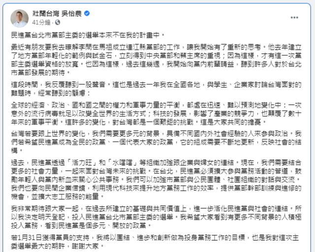 吳怡農說,他非常期待跟大家一起,在過去所建立的基礎與共同價值上,進一步活化民進黨與社會的連結,因此他決定明天登記,投入民進黨台北市黨部主委的選舉,希望大家看到有更多不同背景的人積極投入黨務,看到民進黨是個多元、開放的政黨,「若1月31日獲得黨員的支持,我將以團結、進步和創新做為投身黨務工作的目標,也是我對這次主委選舉最大的期許,謝謝大家。」