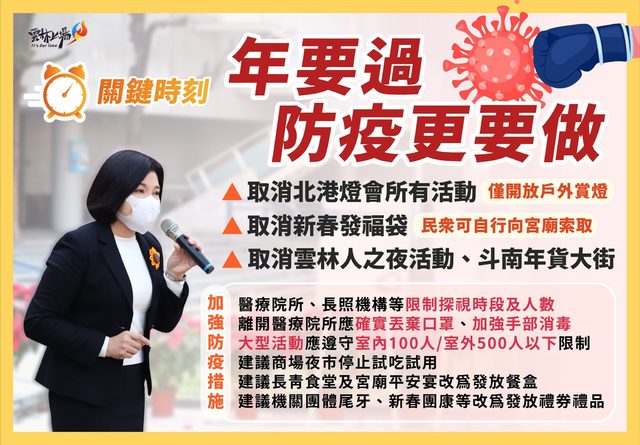 雲林縣縣長張麗善20日晚間宣布,為避免人群聚集的風險,縣府決定取消新春大型活動,包括:新春發福袋行程、團拜、北港燈會、雲林人之夜、斗南年貨大街、大埤新春稻草節等,並強烈建議廟宇減少平安宴,各機關團體取消尾牙及新春團康活動。