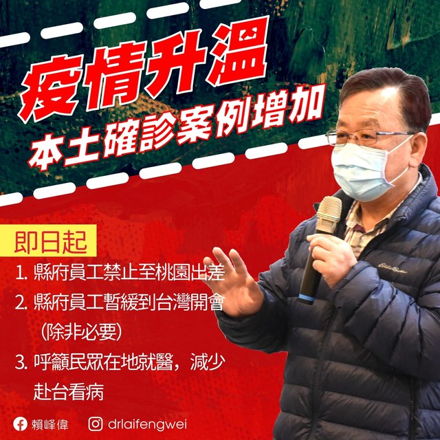澎湖縣縣長賴峰偉20日開出第一槍,宣布即日起,禁止縣府及所屬機關員工前往桃園出差,另除非必要,否則暫緩至台灣本島洽公。