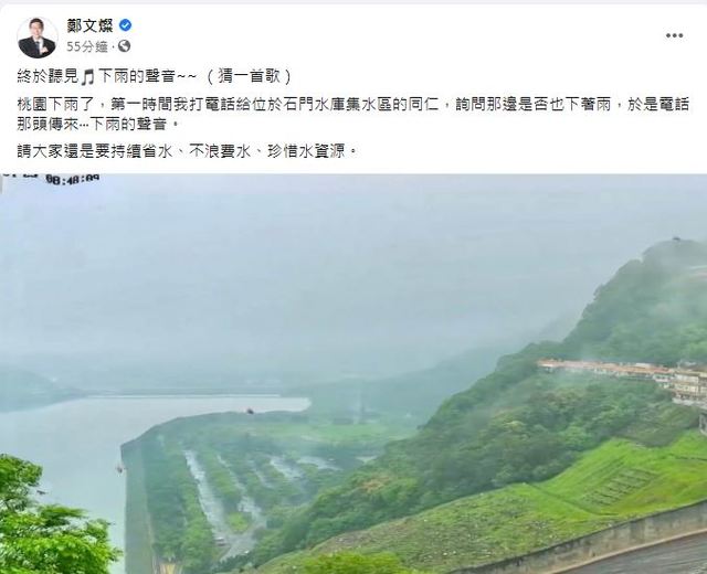 桃園市長鄭文燦也在臉書表示,「桃園下雨了,第一時間我打電話給位於石門水庫集水區的同仁,詢問那邊是否也下著雨,於是電話那頭傳來···下雨的聲音。請大家還是要持續省水、不浪費水、珍惜水資源。」