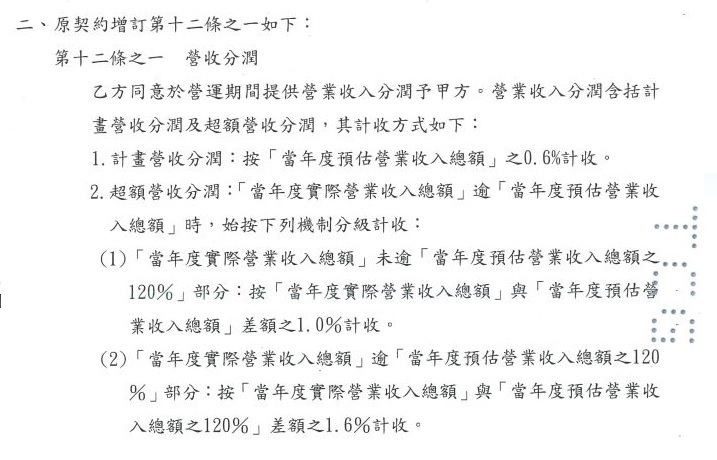 超額營收分潤則分為兩部分,若是「當年度實際營業收入總額」未逾「當年度預估營業收入總額之120%」,則按「當年度實際營業收入總額」與「當年度預估營 業收入總額」差額之1.0%計收。超過120%的部分,則按1.6%計收。
