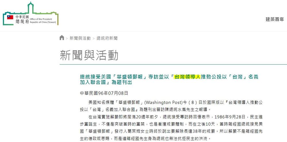 對於「台灣領導人」一詞引發爭議,蔡正元在臉書貼出總統府網站的截圖表示,總統府也同意用「台灣領導人」,他指出,總統府網站上仍掛著2007年7月8日的新聞稿,明白標示著「台灣領導人」的大標題,這個總統府新聞稿是陳水扁接受華盛頓郵報專訪,華盛頓郵報稱呼陳水扁的頭銜,就是「台灣領導人」。