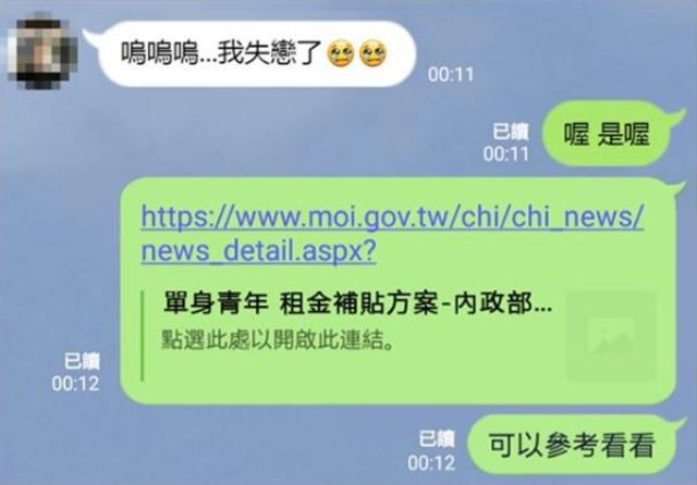 小編透過通訊軟體截圖教學,在對話中,對方傳來「嗚嗚嗚…我失戀了」的傷心訊息,此時,小編示範了如何回覆,他先是回了一個「喔是喔」,隨後又貼上單身青年租金補貼方案的連結,還說「可以參考看看」,讓人又好氣又好笑。