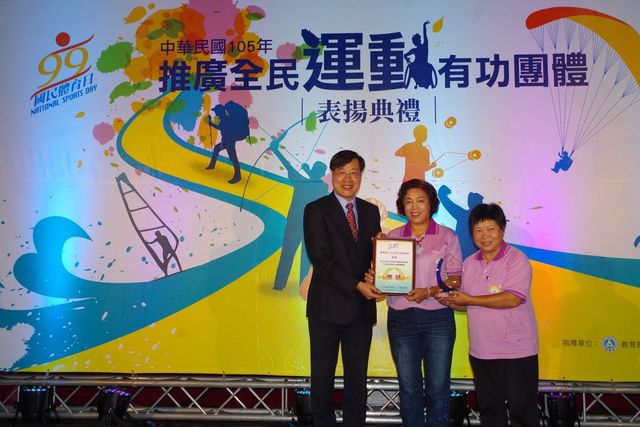 配合推廣99國民體育日,中華民國運動總會於9月1日14:30至16:00,於體育聯合辦公大樓大禮堂舉辦「中華民國105年推廣全民運動有功團體表揚典禮」,由前教育部長吳清基頒發入圍團體獎狀、教育部體育署王漢忠主任秘書頒發獎狀及獎牌給推廣水域運動得獎團體,中華民國體育運動總會張朝國會長頒發獎狀及獎牌給推廣山域運動、空域運動、傳統及原住民運動、特殊運動、全民運動等獎項的得獎團體。