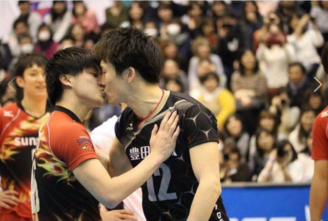 太陽鳥隊的二傳手山本湧(Yu Yamamoto)和豊田合成主攻高松卓矢(Takuya Takamatsu)不小心起了衝突,比賽中山本永得分卻做出挑釁的動作,引來高松卓矢不滿,2人隨即開始互相推擠,衝突越來越大,快要打起來之際,劇情神展開,2人深情一吻化解尷尬,影片中還拍到雙方嬌羞表情,還有觀眾席女孩們開心的樣子,腐女魂瞬間被喚醒。