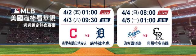華視小編滾一編也興奮地說,本週第一場MLB賽事就要開始了,明(2)日開打的首戰是由克里夫蘭印地安人(Cleveland Indians)對上底特律老虎(Detroit Tigers),而轉播時間是從4月2日的凌晨1點開始,4月3日上午9點半則會再重播一次;4月4日的比賽則是由洛杉磯道奇(Los Angeles Dodgers)對上科羅拉多洛磯(Colorado Rockies),轉播時間為4日早上8點,重播時間則是在5日的凌晨1點。