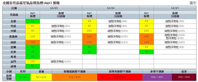空氣品質方面,根據環保署空氣品質預報資訊,東北風持續減弱,西半部風速偏弱,污染物易累積,雲嘉南以南擴散條件差,要留意空污累積。 各地空氣品質等級,宜蘭、花東空品區及馬祖、澎湖地區為「良好」等級;北部、竹苗、中部、雲嘉南空品區及金門地區為「普通」等級,雲嘉南局部地區清晨及晚間可能達橘色提醒等級;高屏空品區為「橘色提醒」等級。