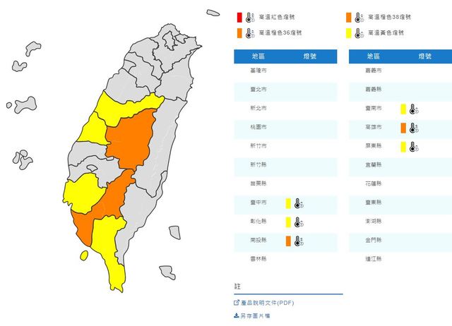 五月的第二個禮拜天,也就是母親節,氣象局觀測指出,今天白天台灣各地及澎湖大多為多雲到晴,高溫炎熱。最高溫上看36度,若要出門踏青記得留意防曬以及水份補充。到了午後,北部、東半部地區及中南部山區可能會有局部短暫雷陣雨,外出也別忘了攜帶雨具。北部約24到36度、中部24到37度、南部23到37度、東部23到35度。 天氣炎熱,氣象局今日稍早也針對六個現是發布高溫警示資訊,中午前後南投縣、高雄市近山區或河谷為橙色燈號,有連續出現36度高溫的機率,請加強注意。台中市、彰化縣、台南市、屏東縣近山區或河谷為黃色燈號。氣象局提醒民眾避免非必要的戶外活動,注意防曬、多、慎防熱傷害。