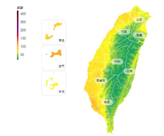 空品方面,根據環保署空氣品質預報資訊,今日受東北季風影響,中部以北地區擴散條件佳,空氣品質普遍良好;南部地區位在下風處,擴散條件較差,易累積污染物;北部、竹苗、中部、宜蘭、花東空品區及澎湖地區為「良好」等級;雲嘉南空品區及馬祖、金門地區為「普通」等級;高屏空品區為「橘色提醒」等級。