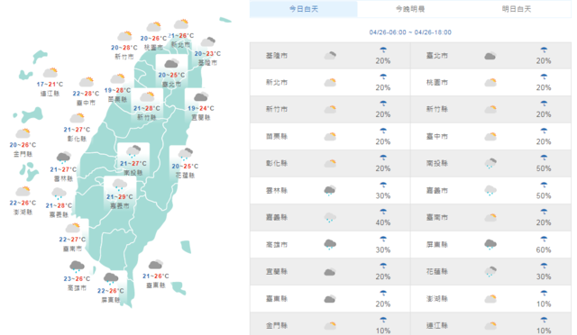 氣象局表示,今(26)日中部以北短暫雨後轉多雲為主,東半部及南部地區水氣仍多,仍會有些局部短暫雨出現,但比較顯著的降雨還是在西半部山區的午後熱對流,在中南部山區有局部較大雨勢發生的可能;北部、東半部高溫約25、26度,中南部地區在28度左右,至於低溫方面變化不大,各地約20至23度。