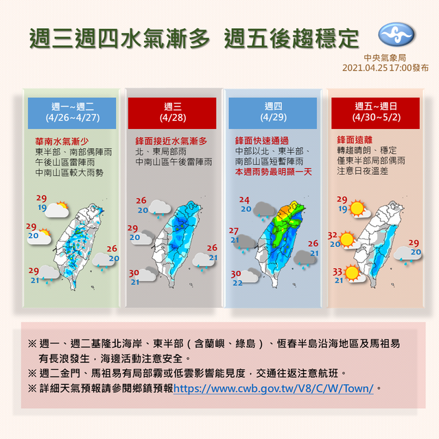 週三(28日)起,鋒面逐漸接近,北部及東半部地區有局部短暫雨,午後中南部山區亦有局部短暫雷陣雨,其他地區為多雲;週四(29日)鋒面通過及東北風增強,北部及東北部氣溫稍下降,北部及東北部地區有短暫陣雨,中部、東部、東南部地區及南部山區有局部短暫陣雨,其他地區為多雲。