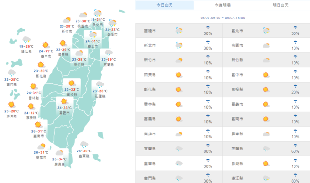 關心天氣!中央氣象局表示,今、明(7-8日)兩天鋒面位於台灣北部海面,台灣東半部地區及金門有局部短暫陣雨,午後大台北地區及西半部山區則有局部短暫雷陣雨;另白天氣溫高且紫外線強,各地高溫約29到34度。
