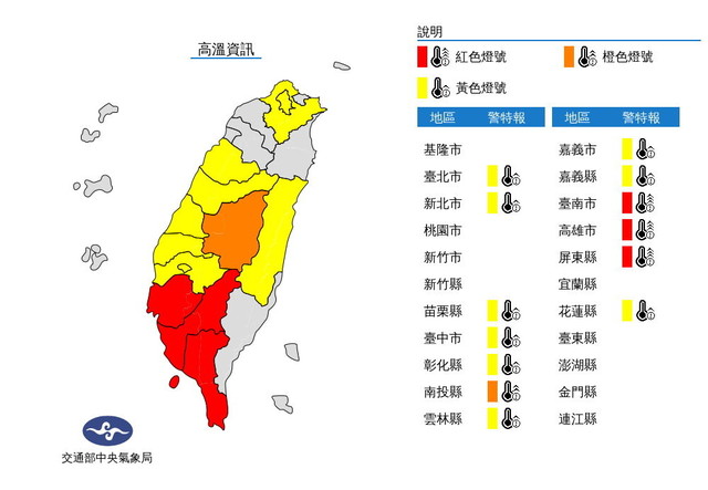 中央氣象局今(16)日對13縣市發布「高溫資訊」,氣象局表示,天氣晴朗炎熱,今日中午前後台南市、高雄市、屏東縣近山區或河谷為「紅色燈號」,有連續出現38度極端高溫的機率;南投縣近山區或河谷為「橙色燈號」,有38度極端高溫出現的機率;台北市、新北市盆地、嘉義縣市、苗栗縣、台中市、彰化縣、雲林縣近山區或河谷及花蓮縣縱谷為「黃色燈號」。