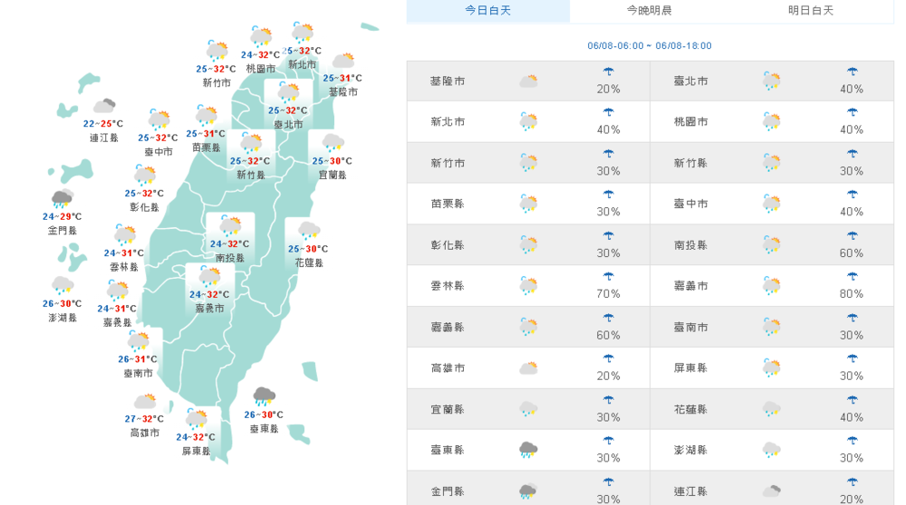 氣象局表示,今(8)天東半部地區及恆春半島有局部短暫陣雨或雷雨,其他地區為多雲見陽光的天氣,午後有局部短暫雷陣雨,其中各地山區及中南部地區並有局部大雨發生的機率,請注意短延時強降雨及雷擊、強陣風等較劇烈的天氣現象,各地高溫約30至33度,高溫較昨天升溫,感受比較悶熱。