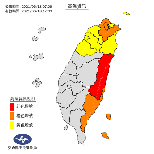 關心天氣!中央氣象局表示,今(18)日受西南風沉降影響,東南部地區有焚風發生的機率,中午前後花蓮縣縱谷為紅色燈號,有連續出現38度極端高溫的機率;台北市、新北市、台東縣地區為橙色燈號,有連續出現36度高溫的機率;基隆市地區,新竹縣市、桃園市、苗栗縣、宜蘭縣近山區或河谷為黃色燈號,提醒民眾避免戶外活動,若必要外出時請注意防曬、多補充水份、慎防熱傷害。