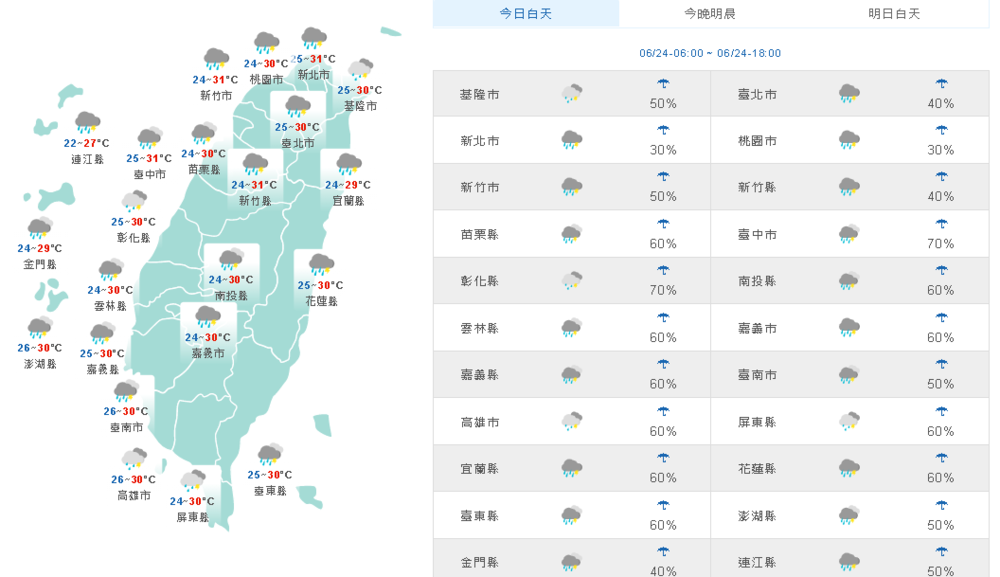 氣象局表示,今天受滯留鋒面影響,儘管鋒面結構變差,各地降雨轉為短暫或較局部,比如西半部及東北部地區有短暫陣雨或雷雨,花東地區也有局部短暫陣雨或雷雨,不過一但有對流發展或通過時,還是容易有局部大雨發生的機率,請留意,尤其連日降雨,山區要留意坍方、落石、溪水暴漲等情形。