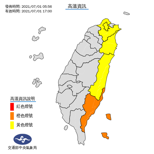 【高溫黃燈】36度以上:台北市、新北市、宜蘭縣、花蓮縣。