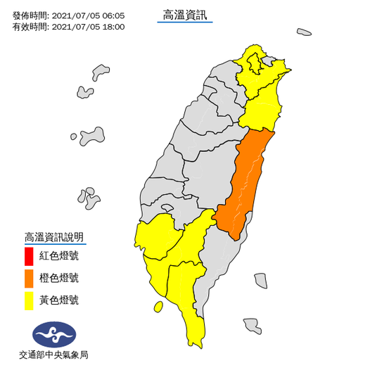【高溫黃燈】36度以上:台北市、新北市、台南市、高雄市、屏東縣、宜蘭縣。
