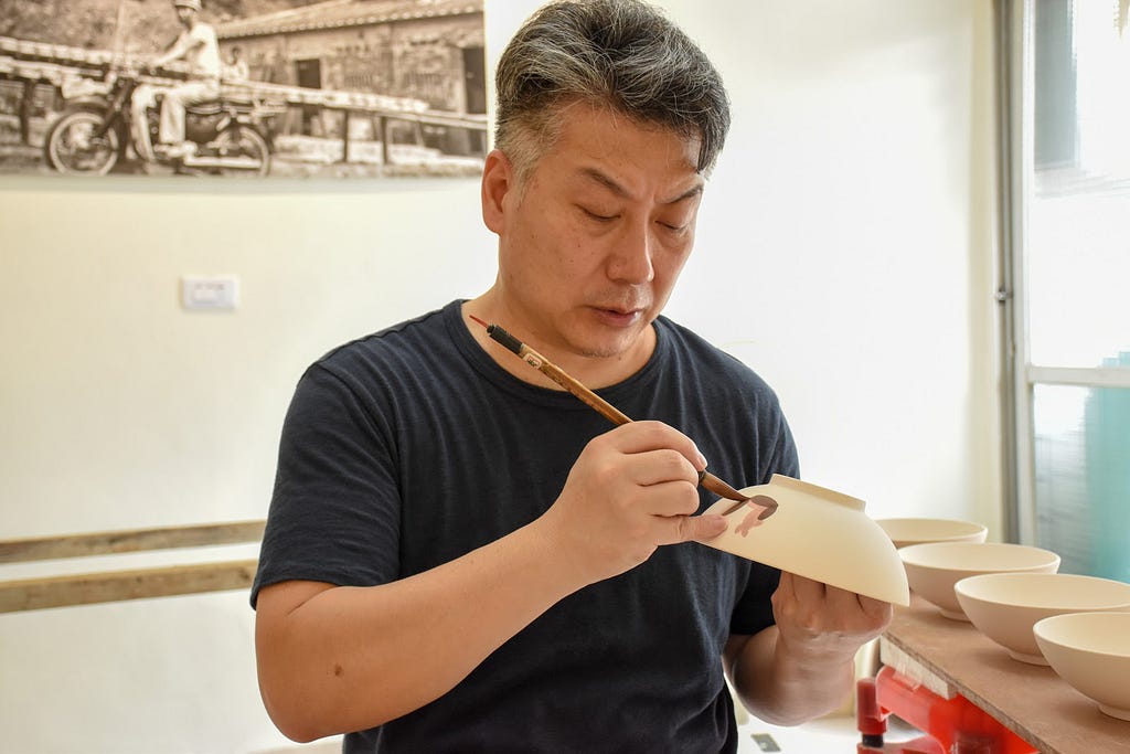 「蝦子象徵多子多孫,公雞就是起家、家庭興旺,以前入厝時會用。兩支螃蟹代表謝謝、感恩,兩棵柿子祝福著事事如意,」延續上一代的精神,蘇正立堅持手繪的質感,以胭脂紅、手繪碗盤重現台灣特色的古早味,「每一筆都是有感情的,是用生命在畫的。」跳脫制式化的工業量產,在這裡每個碗盤都是獨一無二,蘇正立透過他的巧手,讓上一輩古早味的生活陶,完美再現。